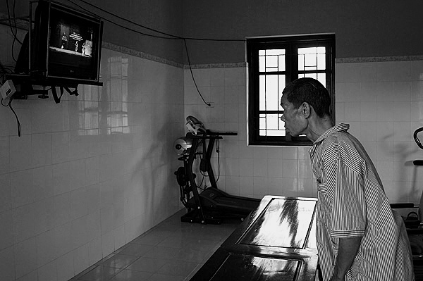 Cách xem TV của thương binh Nguyễn Đình Thắng, quê Thanh Liêm, Hà Nam. Ông đã đến trung tâm điều trị từ năm 1974.