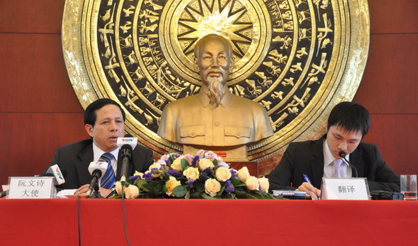 Đại sứ Nguyễn Văn Thơ (trái) trả lời phỏng vấn báo chí. Ảnh: Quang Đức - Phóng viên TTXVN tại Trung Quốc