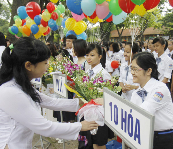 Tặng hoa chúc mừng các học sinh lớp 10 Trường THPT Chu Văn An (quận Ba Đình, Hà Nội). Ảnh: Thanh Tùng