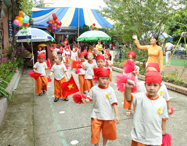 Các bé Trường Mầm non Lý Thái Tổ I (quận Cầu Giấy, Hà Nội) trong ngày khai giảng. Ảnh: Minh Quyết
