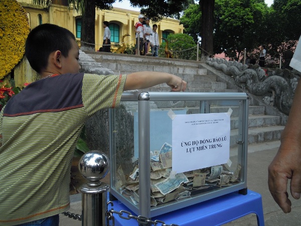 10. Và cuối cùng, một khoảnh khắc không đồ sộ, hoành tráng, cũng không có dự kiến trong chương trình Đại lễ. Tại thềm rồng trước điện Kính Thiên, rất nhiều em nhỏ theo gia đình vào thăm Hoàng thành, đã lặng lẽ cho tiền vào hòm quyên góp ủng hộ đồng bào bị lũ lụt miền Trung. Chiếc hòm quyên góp do Đoàn TNCS Hồ Chí Minh của Trung tâm Bảo tồn Di tích Cổ Loa - Thành cổ Hà Nội đặt ở vị trí long trọng bên thềm Rồng, bên trong tường rào bảo vệ di tích như một lời nhắc nhở đầy ý nghĩa: Vui Đại lễ không quên lũ lụt miền Trung, và Hà Nội ngàn năm luôn canh cánh bên những đồng bào đang gặp khó khăn.