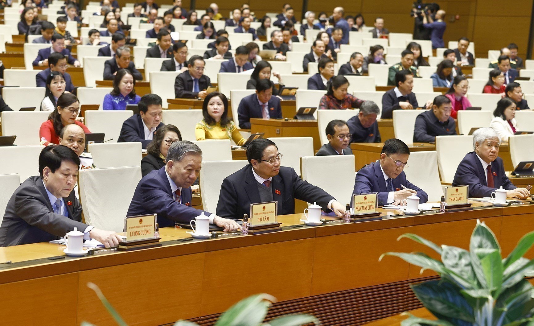 Tổng Bí thư Tô Lâm, Chủ tịch nước Lương Cường, Thủ tướng Phạm Minh Chính, Chủ tịch Quốc hội Trần Thanh Mẫn biểu quyết thông qua các luật, nghị quyết. Ảnh: Doãn Tấn - TTXVN