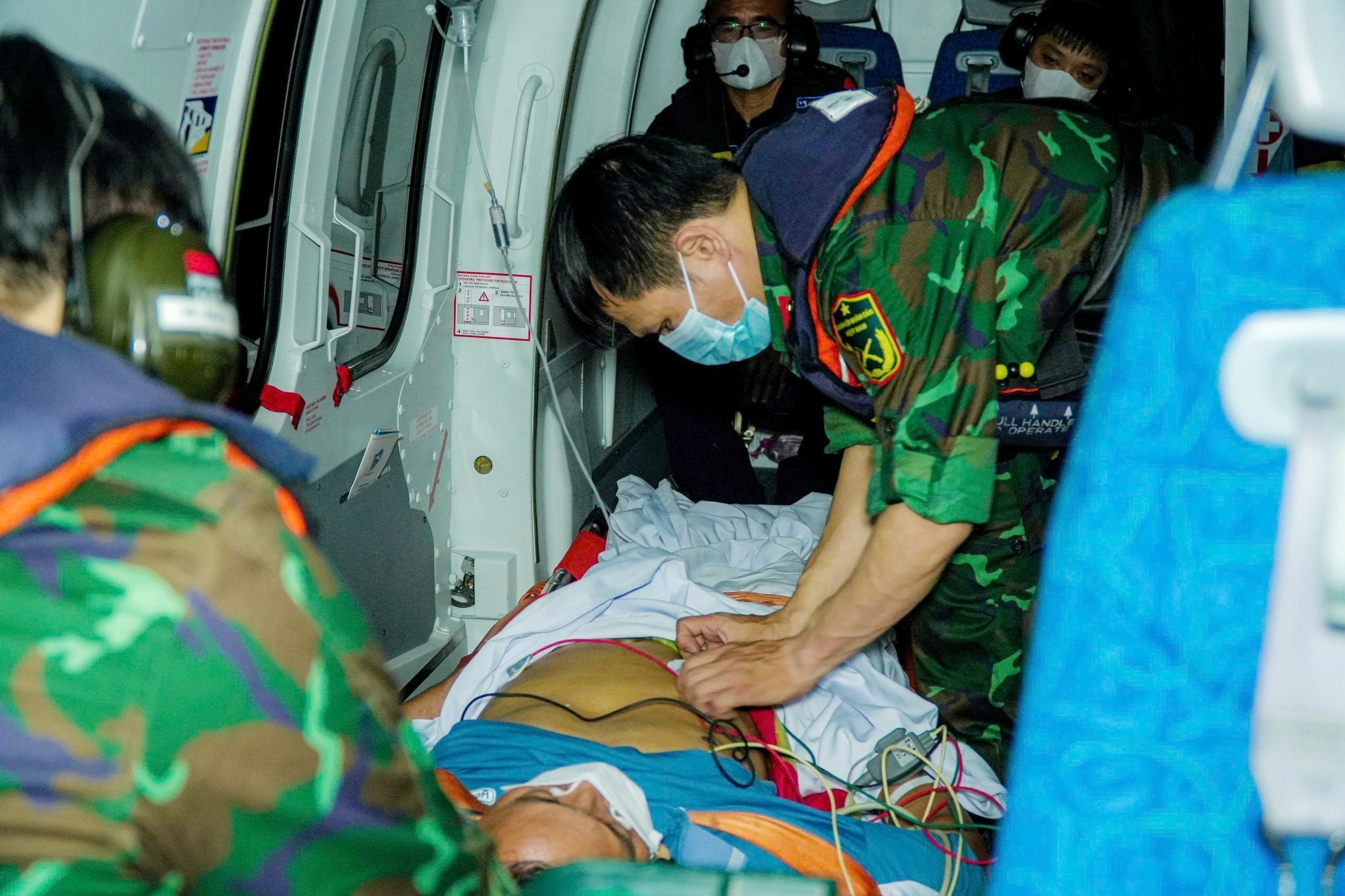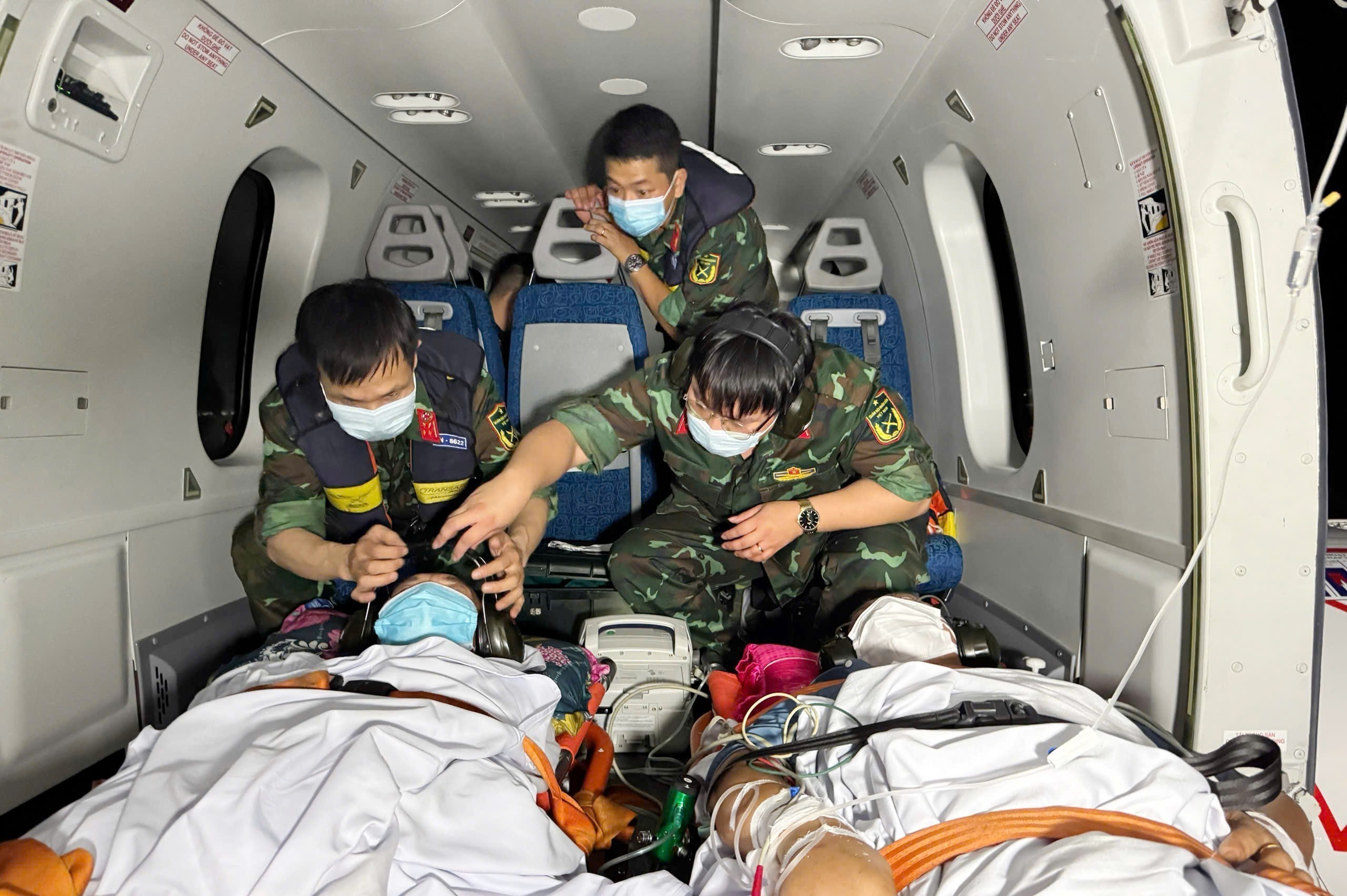 Các bác sĩ Tổ Cấp cứu đường không của Bệnh viện Quân y 175 xử lí, đảm bảo an toàn cho người bệnh trong quá trình vận chuyển về đất liền