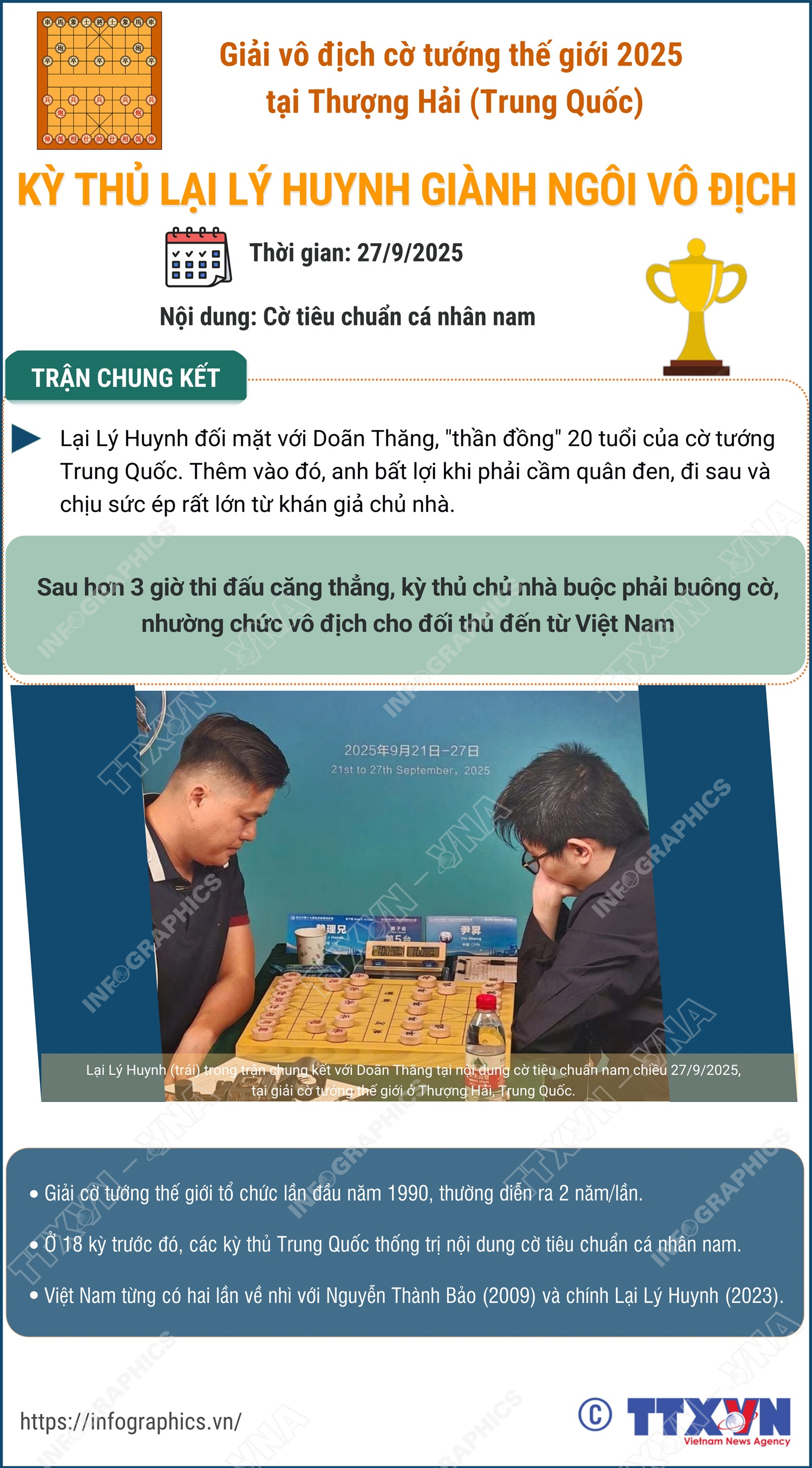 Chiều 27/9/2025, lịch sử cờ tướng Việt Nam cũng như thế giới sang trang mới khi kỳ thủ Việt Nam, Lại Lý Huynh đánh bại kỳ thủ Trung Quốc, Doãn Thắng trong trận chung kết đầy kịch tính để giành chức vô địch thế giới 2025. Đây là lần đầu tiên Việt Nam và cũng là lần đầu tiên có 1 kỳ thủ ngoài Trung Quốc bước lên ngôi cao nhất ở giải cờ tướng lớn nhất hành tinh được bắt đầu tổ chức từ năm 1990.