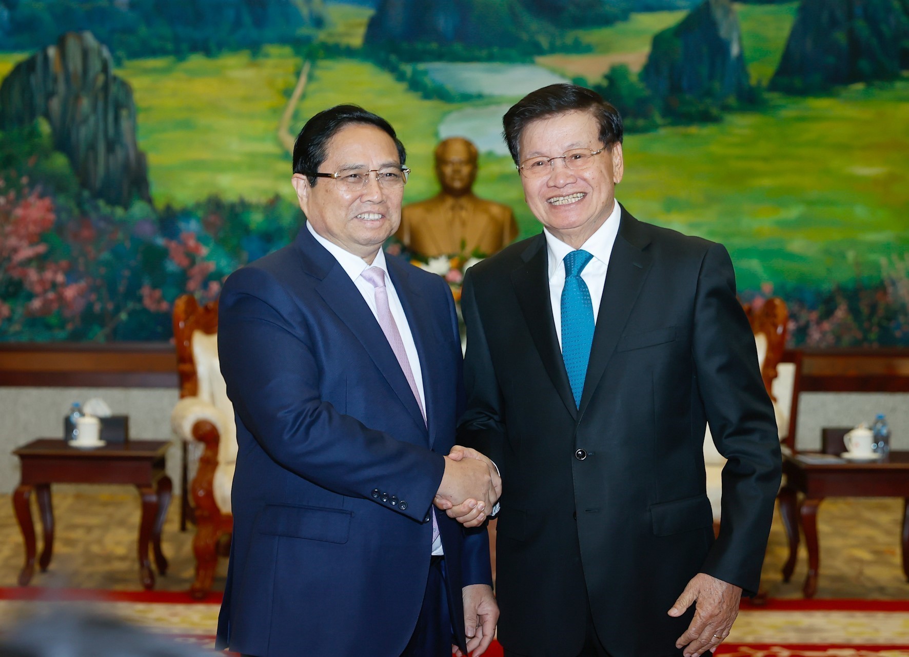 Sáng 10/1/2025, tại Vientiane, trong chuyến thăm, làm việc tại Lào, Thủ tướng Phạm Minh Chính đến chào Tổng Bí thư, Chủ tịch nước Lào Thongloun Sisoulith. Ảnh: Dương Giang-TTXVN