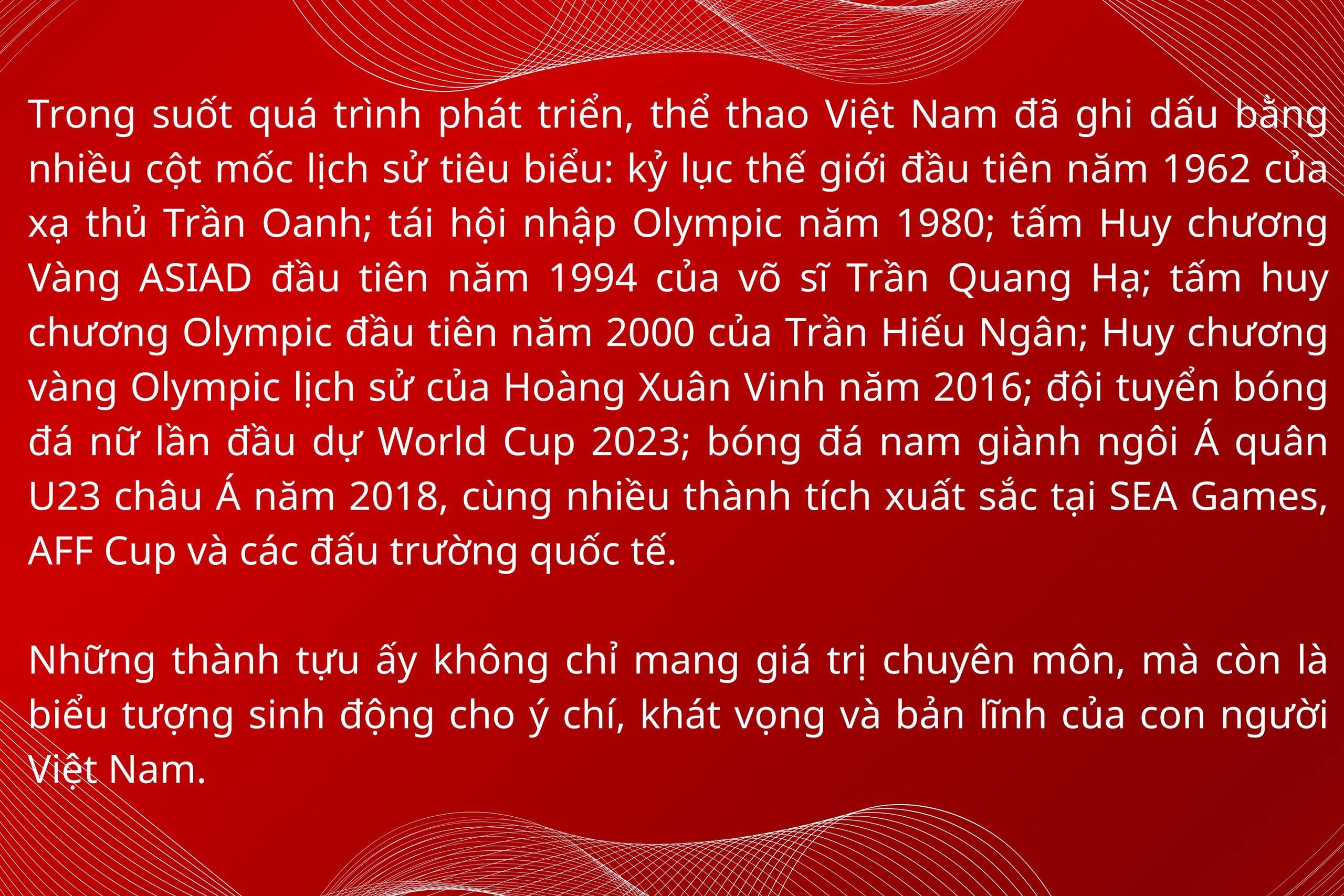 - Năm 2026 đánh dấu tròn 80 năm Thể thao Việt Nam hình thành và phát triển dưới sự lãnh đạo của Đảng và Chủ tịch Hồ Chí Minh kính yêu - một chặng đường dài gắn bó chặt chẽ với lịch sử dựng nước, giữ nước và phát triển đất nước. Nhìn lại hành trình 8 thập kỷ, đây là một chặng đường rất đáng tự hào, thể hiện rõ vai trò, vị trí của thể dục thể thao trong sự nghiệp cách mạng của dân tộc.