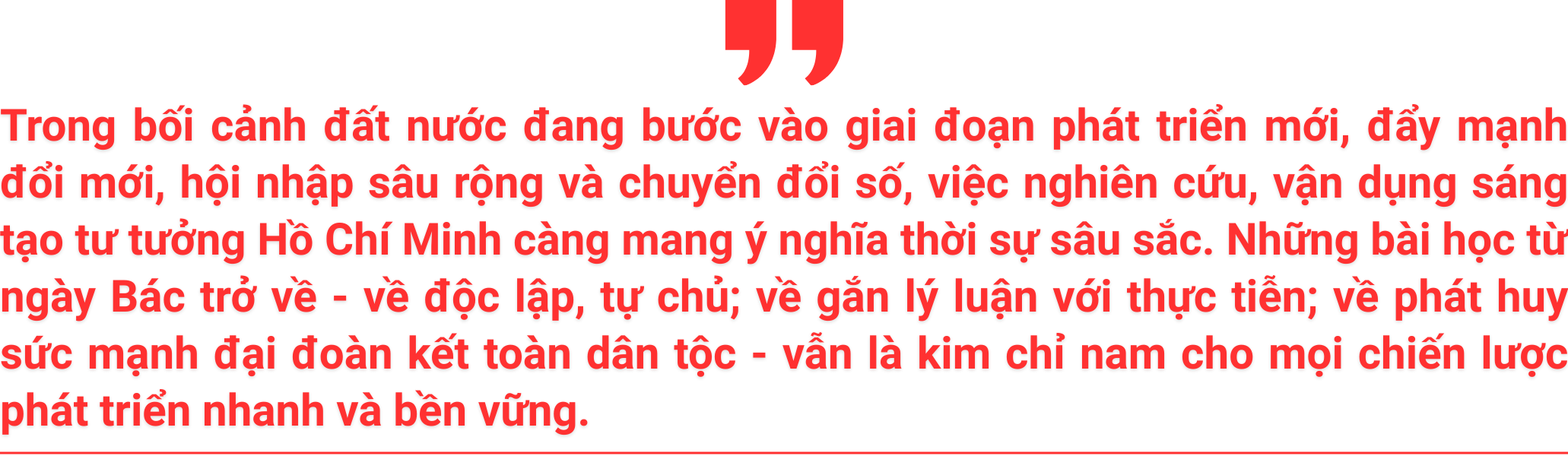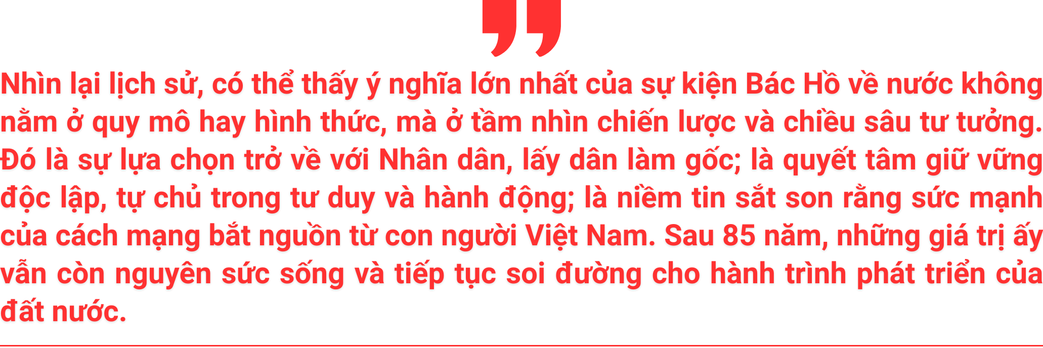 Đó không chỉ là điểm kết thúc của một hành trình cá nhân, mà là sự hội tụ trọn vẹn giữa lý tưởng, trí tuệ và thực tiễn cách mạng. Sau ba thập niên hoạt động không mệt mỏi ở nhiều châu lục, Người trở về với Nhân dân khi đã tích lũy đầy đủ kinh nghiệm quốc tế, hiểu sâu sắc thời đại và mang trong mình niềm tin vững chắc vào sức mạnh của quần chúng. Từ thời khắc ấy, cách mạng Việt Nam có được sự lãnh đạo trực tiếp của một tư duy lớn, một bản lĩnh lớn và một tấm lòng trọn vẹn vì độc lập dân tộc.