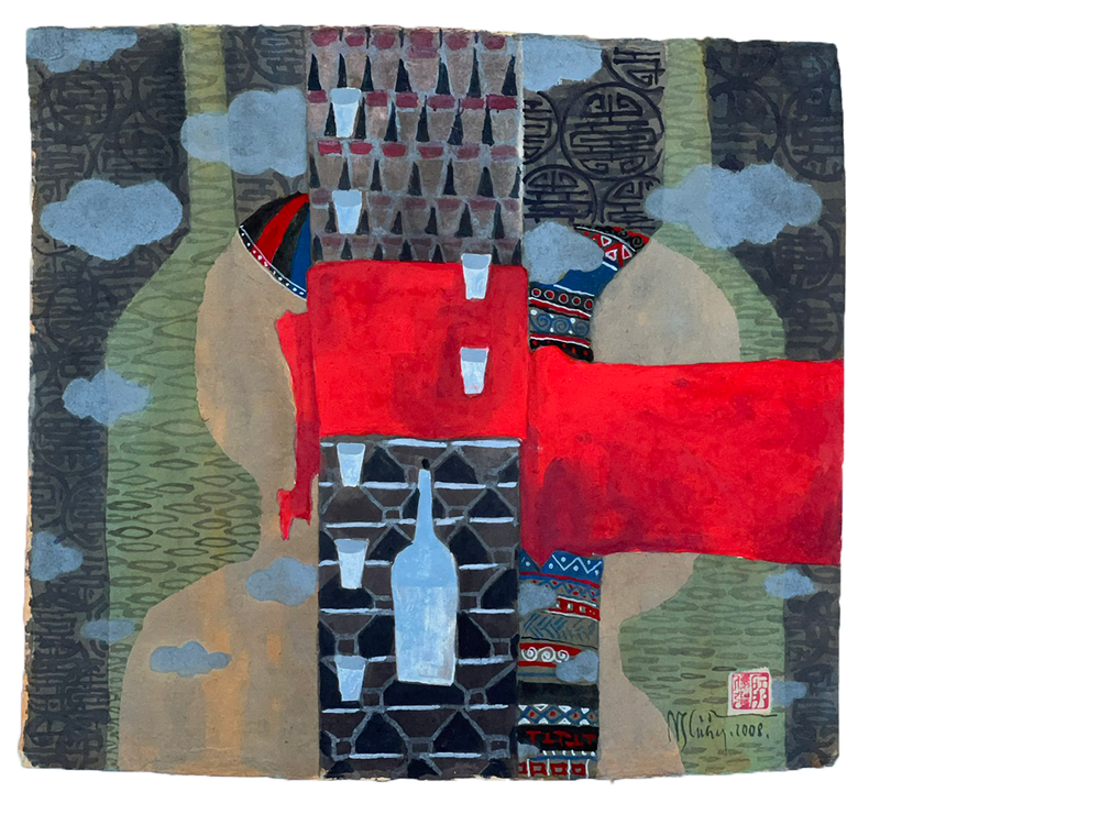 Không cần diện tích đồ sộ để gây ấn tượng mỗi bức tranh khiêm tốn về tỉ lệ nhưng chứa đựng chiều sâu cảm xúc. Những hình tượng chai rượu, tấm vải đỏ, tấm gỗ ố màu thời gian tưởng chừng giản dị trở thành ký hiệu của tình yêu, gắn kết, và sự giao hòa giữa con người với đất đai, cộng đồng và những phong tục tập quán đặc sắc của đồng bào dân tộc.