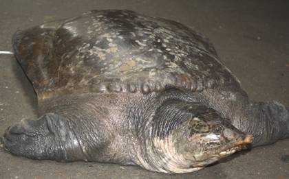 Sau gần nửa giờ vật lộn, ông Toàn đưa được con ba ba lên bờ. Con vật nặng 22kg với chiều dài gần 1 mét và chiều rộng gần nửa mét, trên mai có nhiều hoa văn sần sùi.