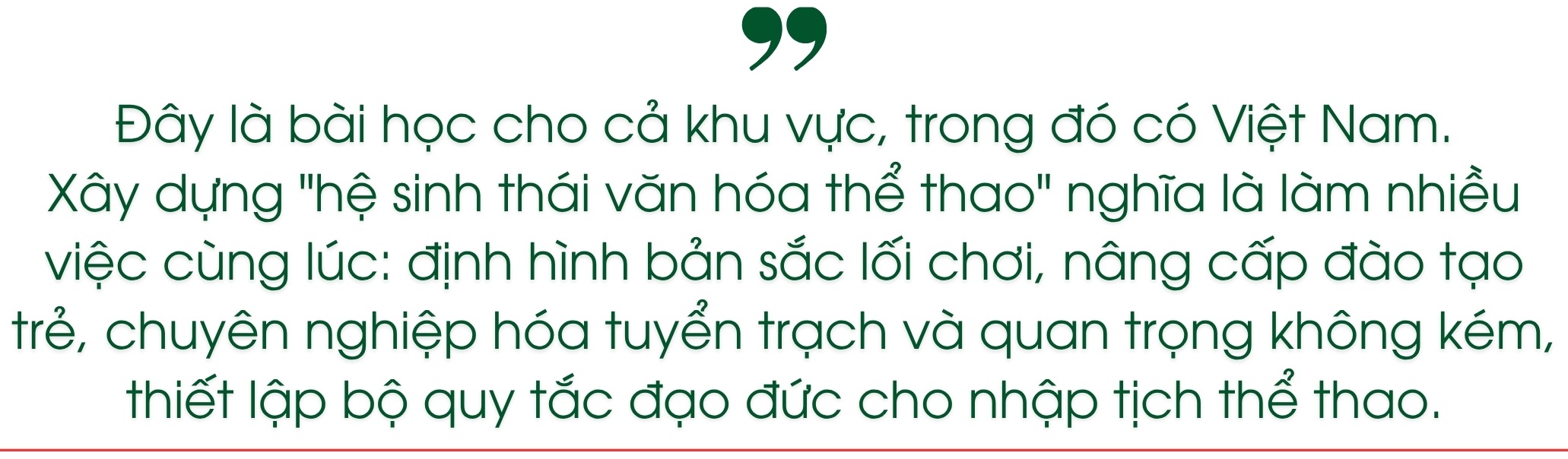 Từ góc độ rộng hơn, đây là bài học cho cả khu vực, trong đó có Việt Nam. Xây dựng "hệ sinh thái văn hóa thể thao" nghĩa là làm nhiều việc cùng lúc: định hình bản sắc lối chơi, nâng cấp đào tạo trẻ, chuyên nghiệp hóa tuyển trạch và quan trọng không kém, thiết lập bộ quy tắc đạo đức cho nhập tịch thể thao. Bộ quy tắc ấy không chỉ đo bằng giấy tờ pháp lý, mà còn bằng thước đo văn hóa: thời gian cư trú thực, mức độ tham gia hoạt động cộng đồng, năng lực ngôn ngữ, sự cam kết lâu dài với nền bóng đá sở tại. Khi tiêu chí được công khai, nhất quán và được kiểm chứng độc lập, tranh cãi sẽ giảm, còn niềm tin sẽ tăng.