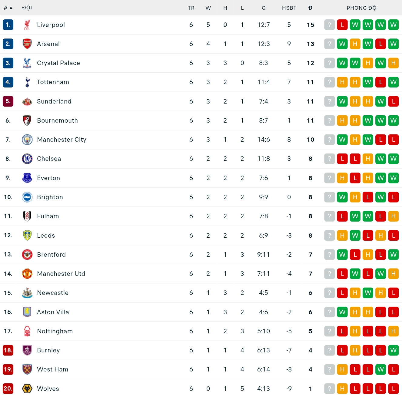 Bảng xếp hạng bóng đá Ngoại hạng Anh - Thethaovanhoa.vn cập nhật nhanh và chính xác nhất kết quả, bảng xếp hạng bóng đá Ngoại hạng Anh vòng 6 mùa 2025-26.