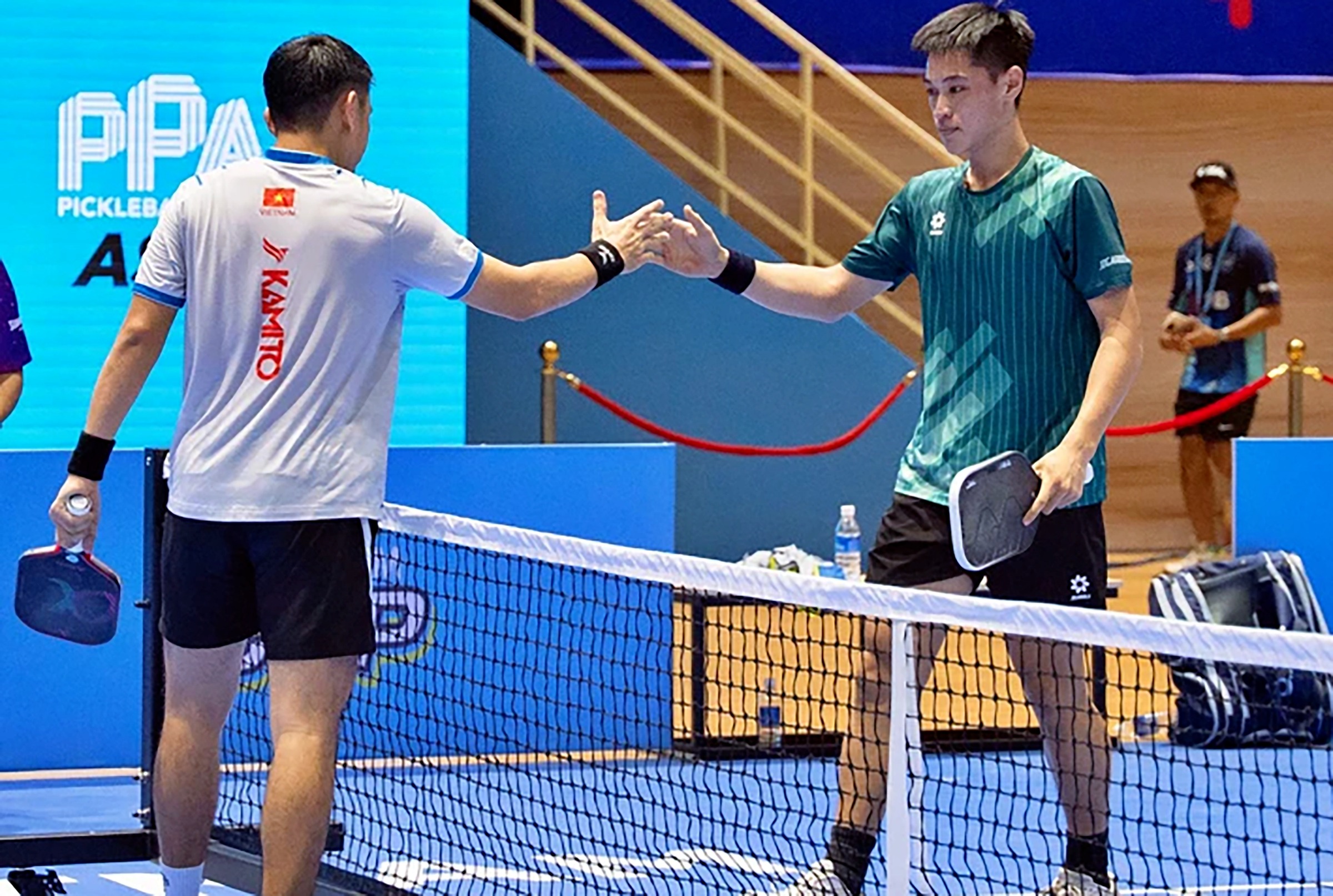 Trương Vinh Hiển (phải) bắt tay Lý Hoàng Nam sau trận bán kết đơn nam pickleball PPA Tour Asia - MB Vietnam Cup 2025 tại Cung thể thao Tiên Sơn, Đà Nẵng trưa 3/10. Ảnh: PPA