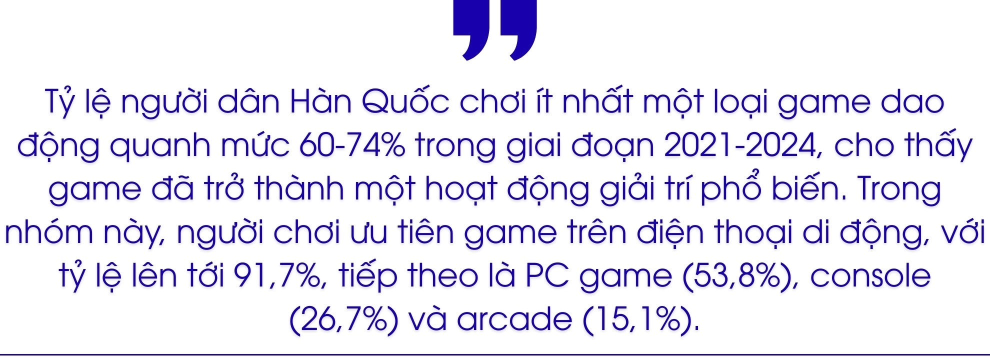 Theo Sách trắng Game Hàn Quốc 2024 của Bộ Văn hóa, Thể thao và Du lịch (VH-TT-DL) Hàn Quốc và Cơ quan Sáng tạo nội dung Hàn Quốc, doanh thu ngành công nghiệp game nước này đã tăng từ 179 nghìn tỷ đồng năm 2014 lên 413 nghìn tỷ đồng năm 2023. Tốc độ tăng trưởng có những giai đoạn bứt phá, như năm 2017 (20,6%) và đặc biệt là năm 2020 (21,3%), thời điểm dịch Covid-19 thúc đẩy nhu cầu giải trí tại nhà.