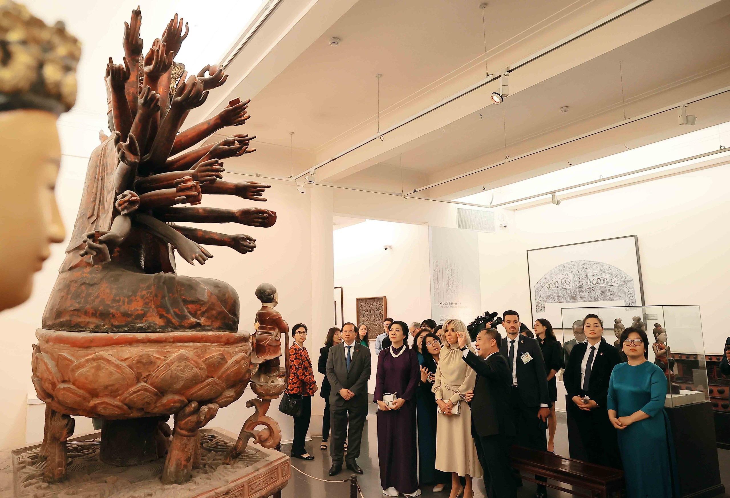 Phu nhân Tổng Bí thư, bà Ngô Phương Ly và Phu nhân Tổng thống Pháp, bà Brigitte Macron tham quan không gian trưng bày hiện vật tại Bảo tàng Mỹ thuật Việt Nam ngày 26/5/2025. Bảo tàng đang ứng dụng mạnh công nghệ bảo tàng số, triển lãm thực tế ảo. Ảnh: An Đăng - TTXVN
