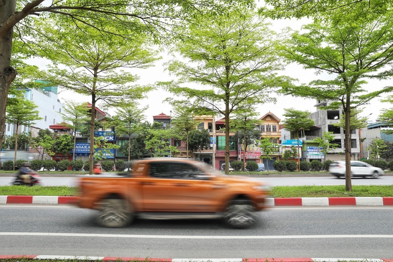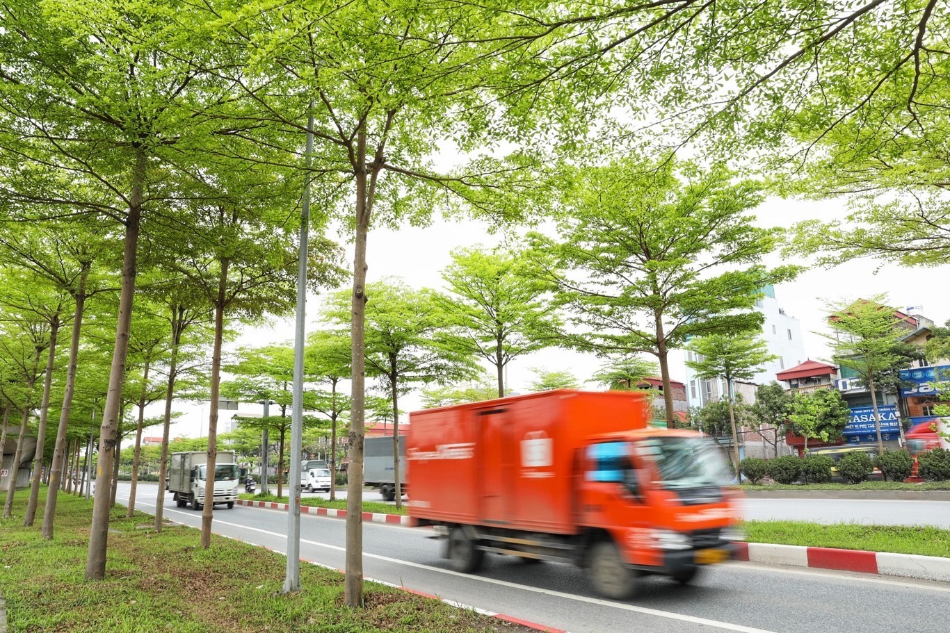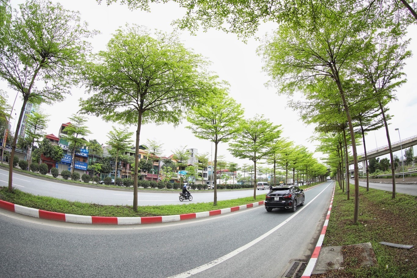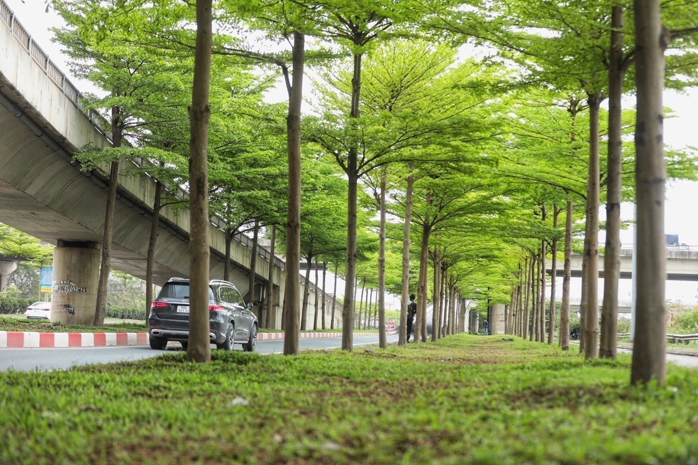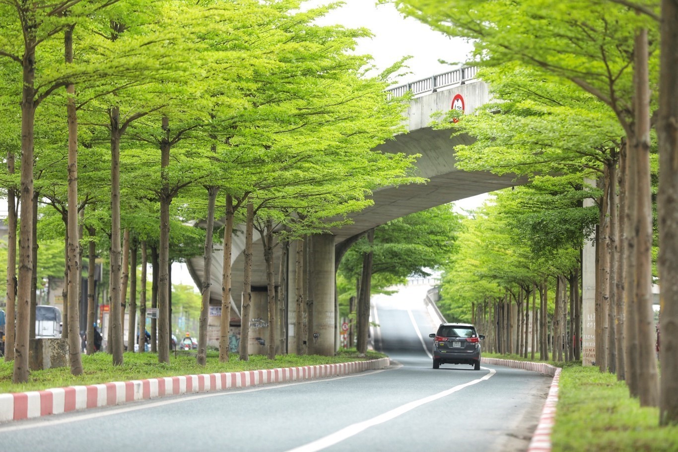 Hàng cây bàng lá nhỏ xanh mướt trên tuyến đường lối lên cao tốc Hà Nội - Bắc Giang