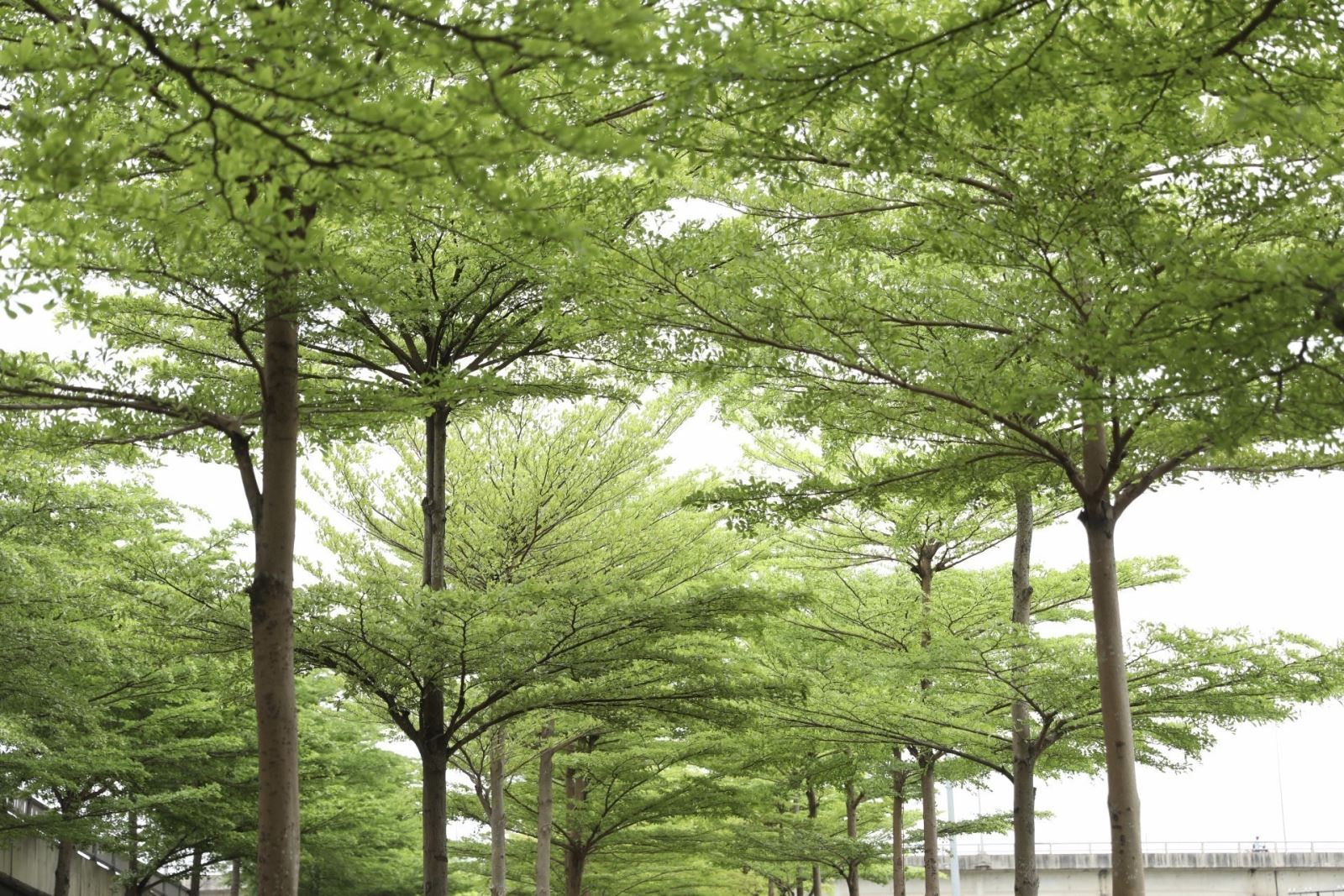 Nhiều hàng cây bàng lá nhỏ thẳng tắp đồng loạt "thay áo" xanh mướt bắt mắt