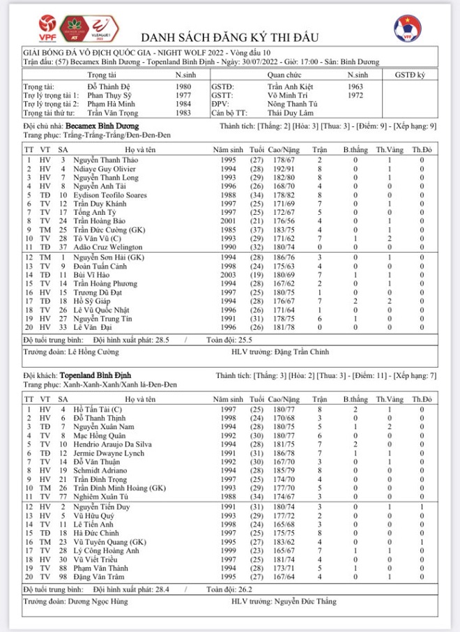 Danh sách đăng ký thi đấu Bình Dương vs Bình Định