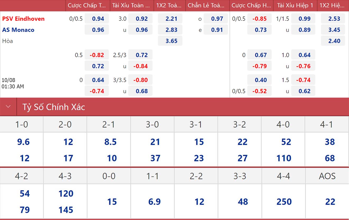 Soi kèo nhà cái PSV vs Monaco. Nhận định bóng đá Cúp C1 (01h30, 10/8). Dự đoán bóng đá PSV vs Monaco. Tỷ lệ kèo Cúp C1.
