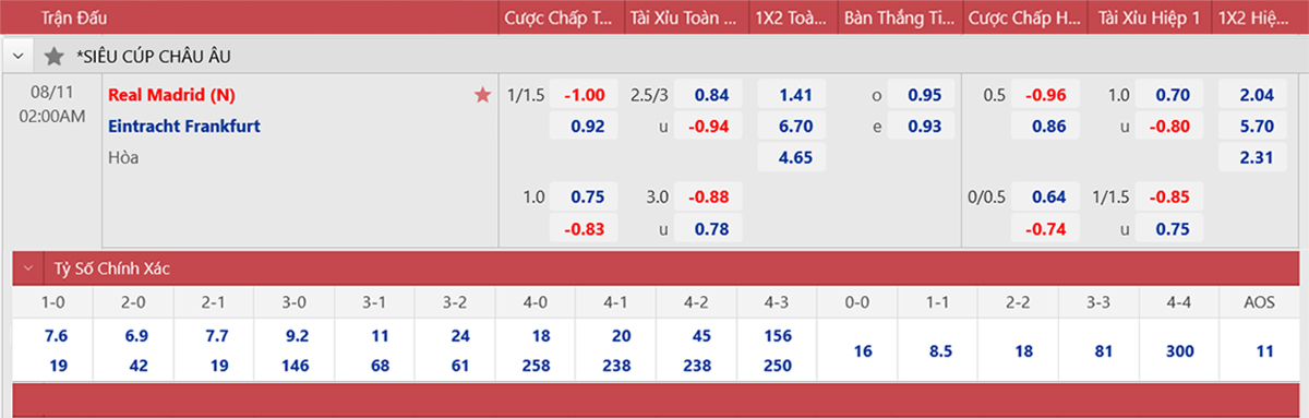 * Tỷ lệ/kèo 90 phút: Real Madrid 0 : 1 1/4 Frankfurt