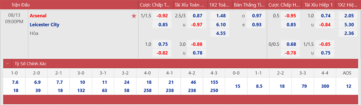 * Tỷ lệ kèo 90 phút: Arsenal 0 : 1 1/4 Leicester