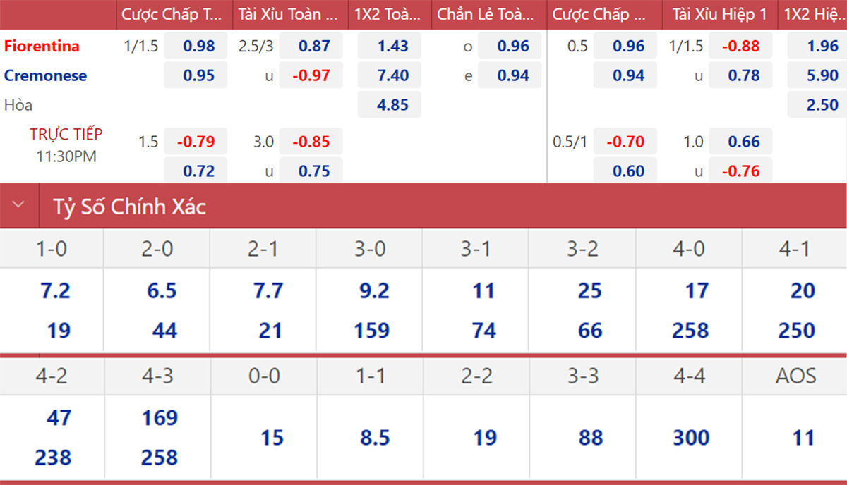 Chủ nhà Fiorentina đã có 13 trận thắng, hai trận hòa và bốn trận thua trong 19 cuộc đọ sức tại Serie A trên sân nhà mùa trước. Cremonese, trong khi đó, có chín trận thắng, ba trận hòa và bảy trận thua trong 19 chuyến hành quân của họ tại Serie B.