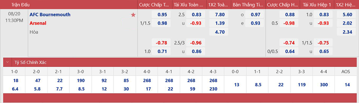 * Tỷ lệ kèo 90 phút: Bournemouth 1 ¼ : 0 Arsenal