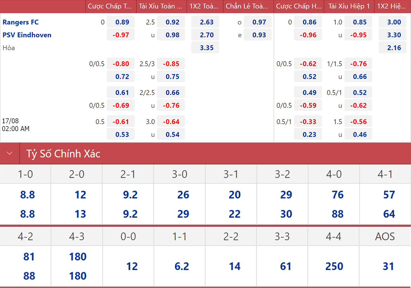 * 02h00, 17/8: PSV vs Rangers (FPT)