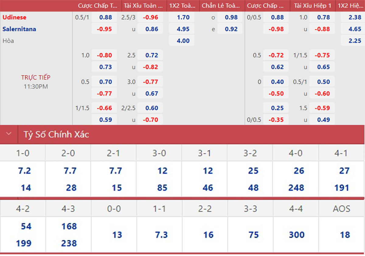 * 23h30, 20/8: Udinese vs Salernitana
