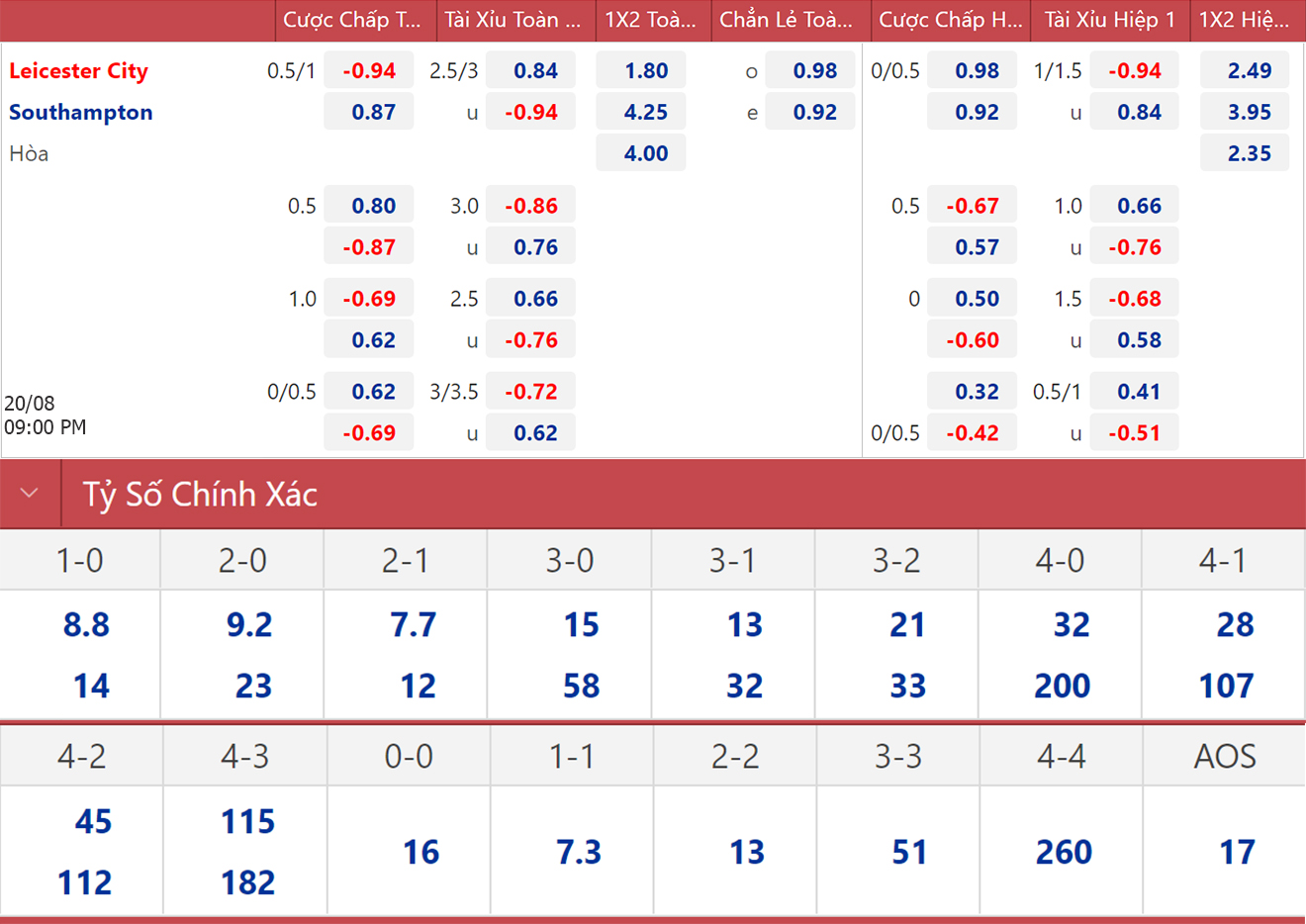 Soi kèo nhà cái Leicester vs Southampton. Nhận định bóng đá Ngoại hạng Anh (21h00, 20/8). Dự đoán bóng đá Leicester vs Southampton. Tỷ lệ kèo bóng đá Ngoại hạng Anh.