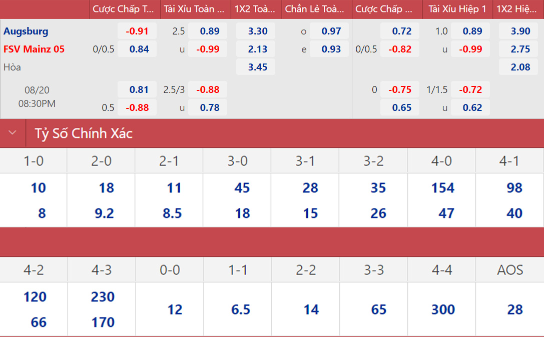 Trên sân nhà mùa trước, Augsburg giành chiến thắng 2-1 trước Mainz. Hiện tại, Augsburg đagn có nhiều cầu thủ chấn thương. Có lẽ vì điều đó mà nhà cái hiện đánh giá Mainz cao hơn. Tuy nhiên, lợi thế sân nhà là điều không thể xem thường đối với Augsburg.