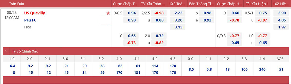 * Tỷ lệ/kèo 90 phút: Quevilly Rouen 0 : 1/4 Pau FC