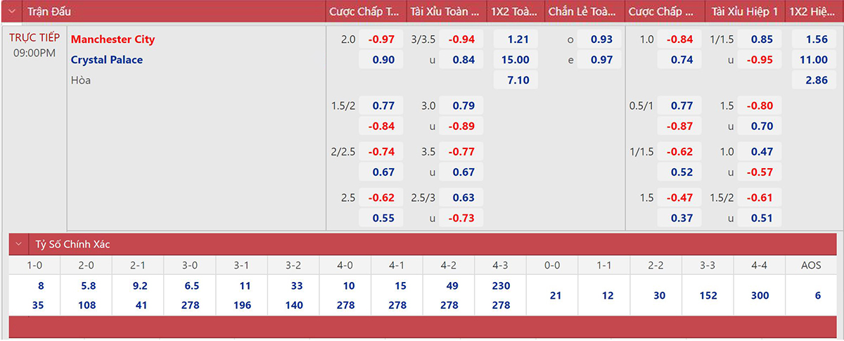 * Tỷ lệ/kèo 90 phút: Man City 0 : 2 Crystal Palace