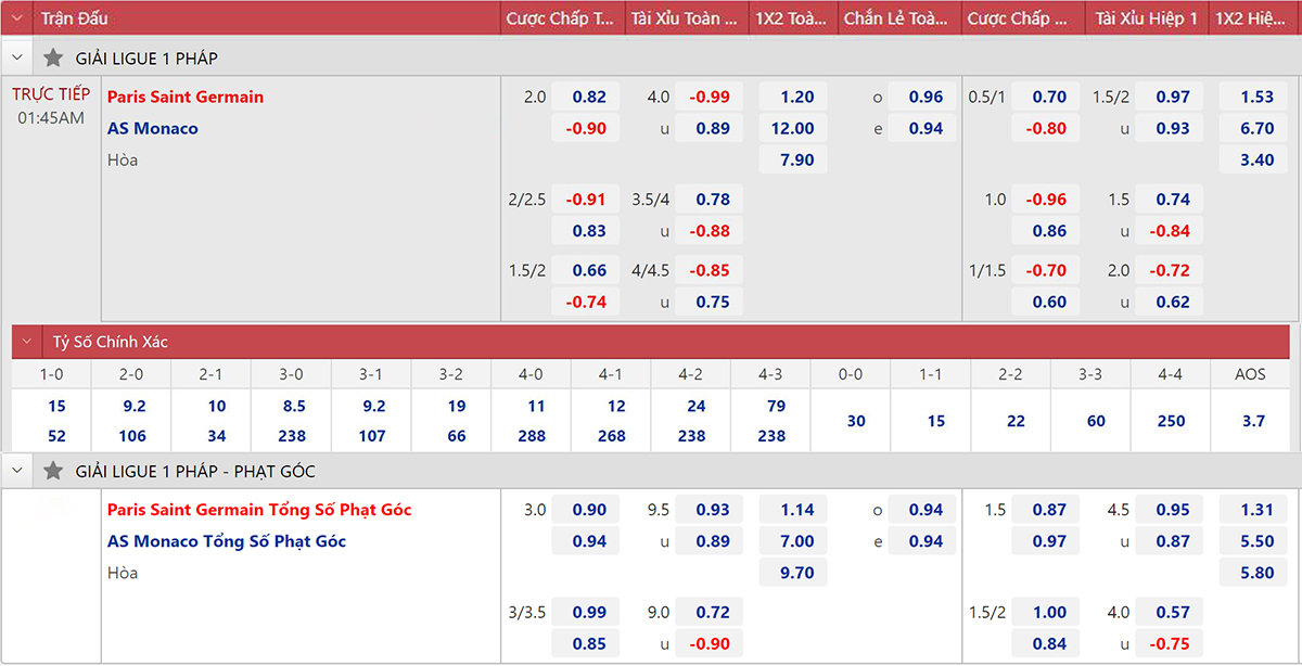 * Tỷ lệ/kèo 90 phút: PSG 0 : 2 3/4 Monaco