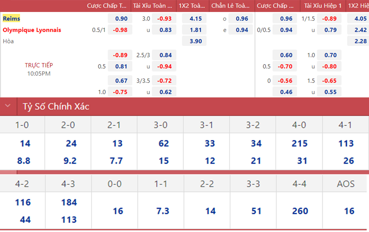 Trong vài lần gặp nhau gần đây, Reims luôn làm khó được Lyon. Tuy nhiện hiện tại, đội chủ nhà đang có phong độ khá tệ khi đã không thắng trong 5 trận gần nhất. Hàng thủ của họ có nhiều vấn đề và điều đó khiến Reims mới chỉ giành được 1 điểm sau 3 vòng đấu đầu tiên.