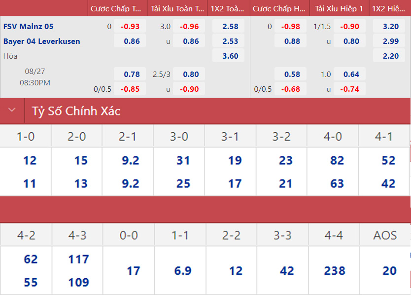 Leverkusen thua cả 3 trận đấu mở màn mùa giải này. Tuy nhiên, họ lại được đánh giá ngang bằng với Mainz dù phải làm khách. Điều này cho thấy, nhà cái thậm chí còn đánh giá Leverkusen có đôi chút nhỉnh hơn Mainz thời điểm này.