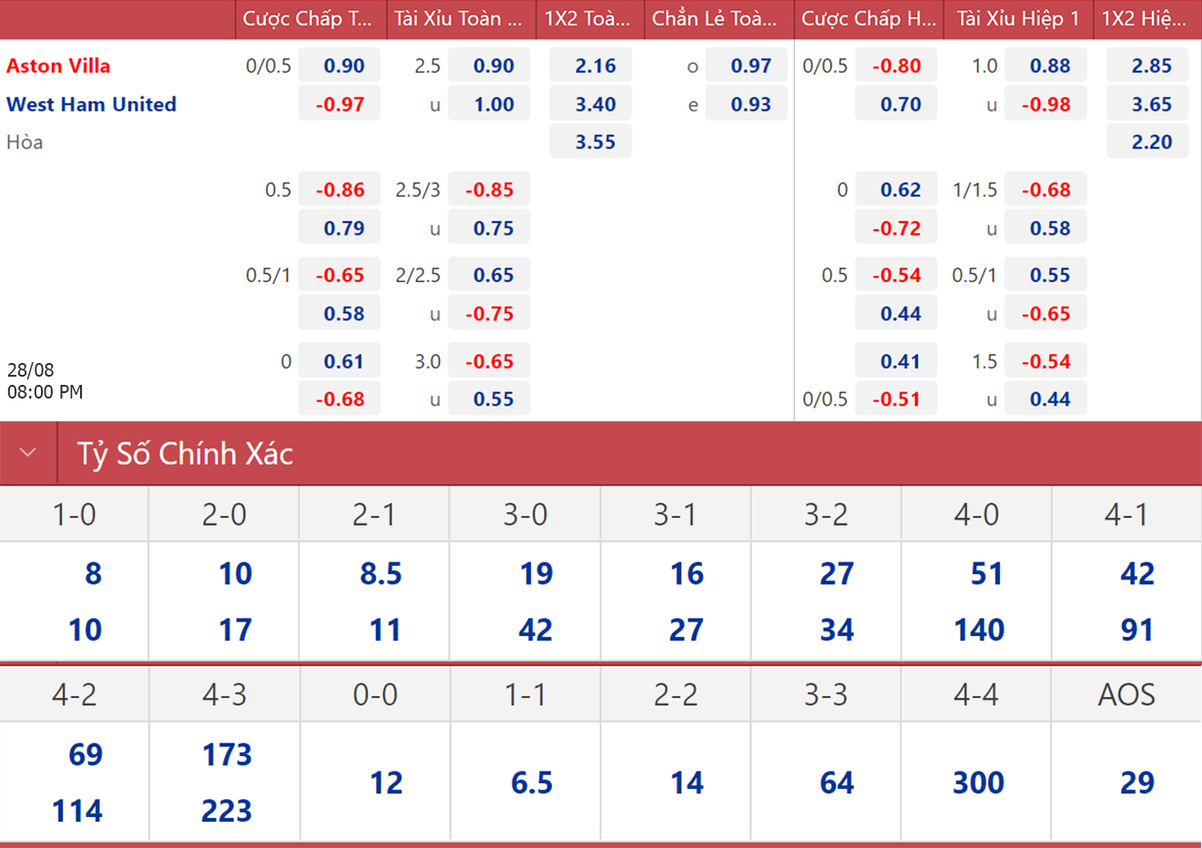 Thực tế, Aston Villa chỉ thắng 3/14 vòng đấu gần nhất. Tuy nhiên, Chủ nhật này họ được đá sân nhà và đối thủ chỉ là đội bét bảng West Ham. Chưa giành được điểm nào sau ba vòng, West Ham sẽ phải vùng vẫy mạnh mẽ nếu không muốn nhanh chóng bị xác định là ứng viên xuống hạng. Họ cũng vừa lấy tinh thần bằng chiến thắng 6-1 chung cuộc trước Viborg.