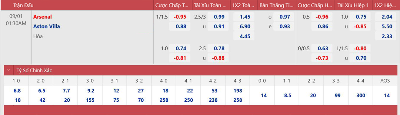 * Tỷ lệ kèo 90 phút: Arsenal 0 : 1 1/4 Aston Villa