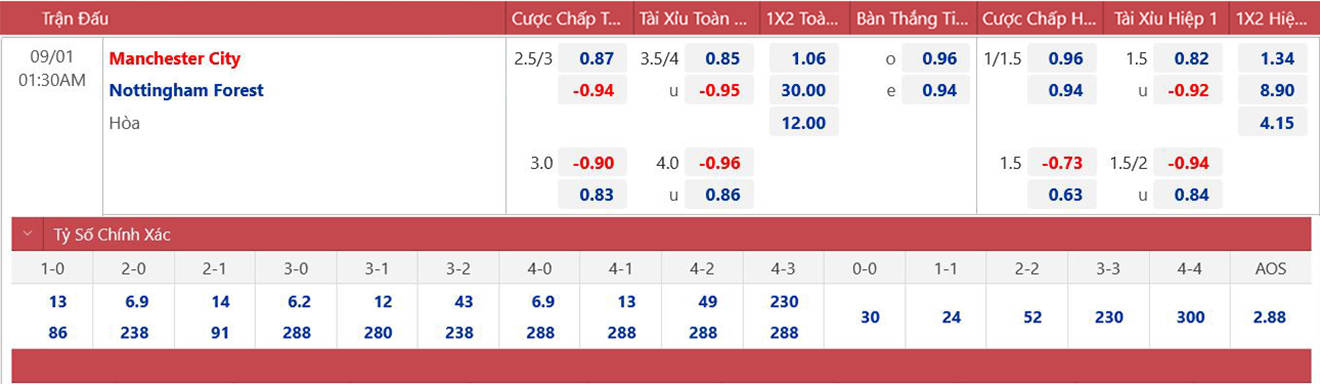 * Tỷ lệ/kèo 90 phút: Man City 0 : 2 3/4 Nottingham