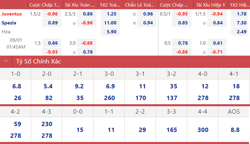 Nhìn vào bảng thống kê tỷ số hầu như các trận đấu có sự tham gia của Juventus vs Spezia đều có khá nhiều bàn thắng. Nhưng trong tay của HLV Max Allegri đang không có nhiều cầu thủ tốt nhất do chấn thương, và phải sắp xếp lực lượng để chuẩn bị cho Cúp C1. Vì thế, Spezia nhiều khả năng sẽ khiến họ phải giằng co.