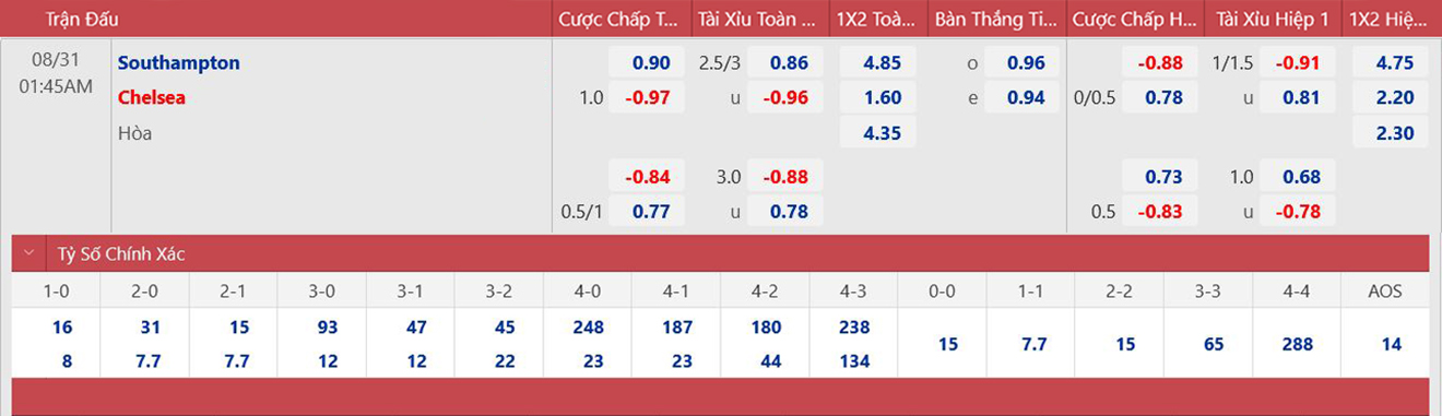 * Tỷ lệ/kèo 90 phút: Southampton 1 : 0 Chelsea
