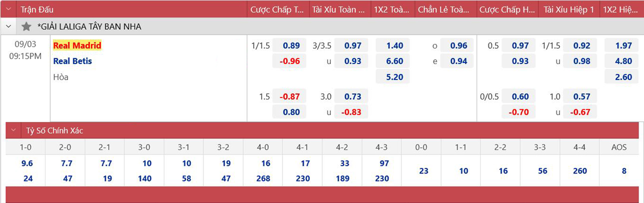 * Tỷ lệ/kèo 90 phút: Real Madrid 0 : 1 1/4 Real Betis