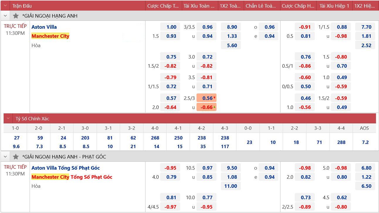 * Tỷ lệ/kèo 90 phút: Aston Villa 1 1/2 : 0 Man City