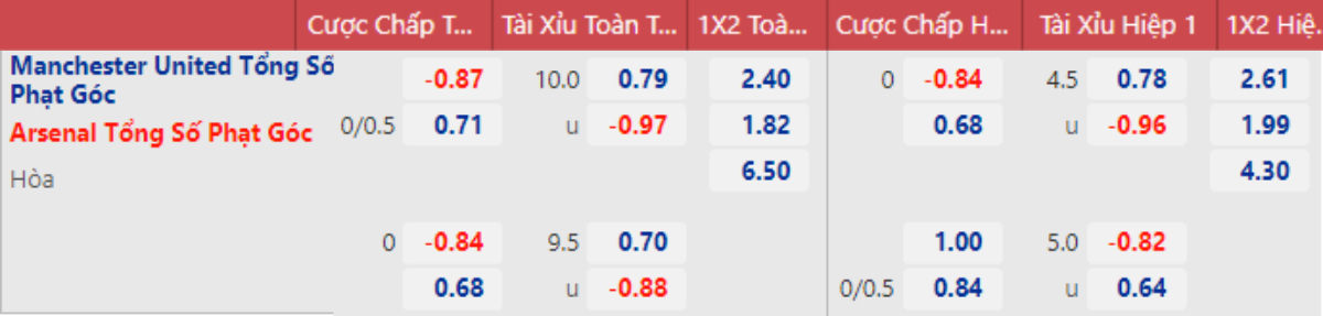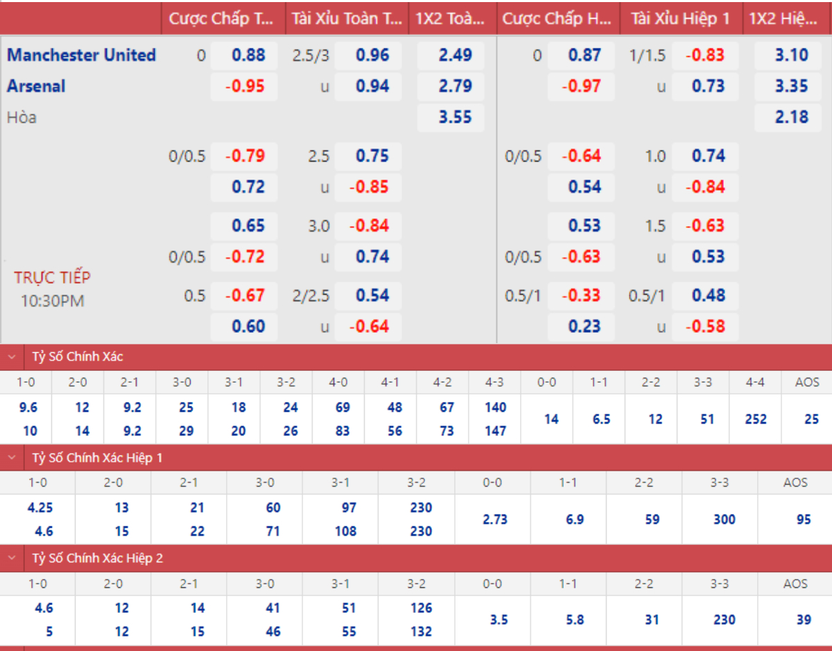 * Tỷ lệ kèo 90 phút: Manchester United 0 : 0 Arsenal