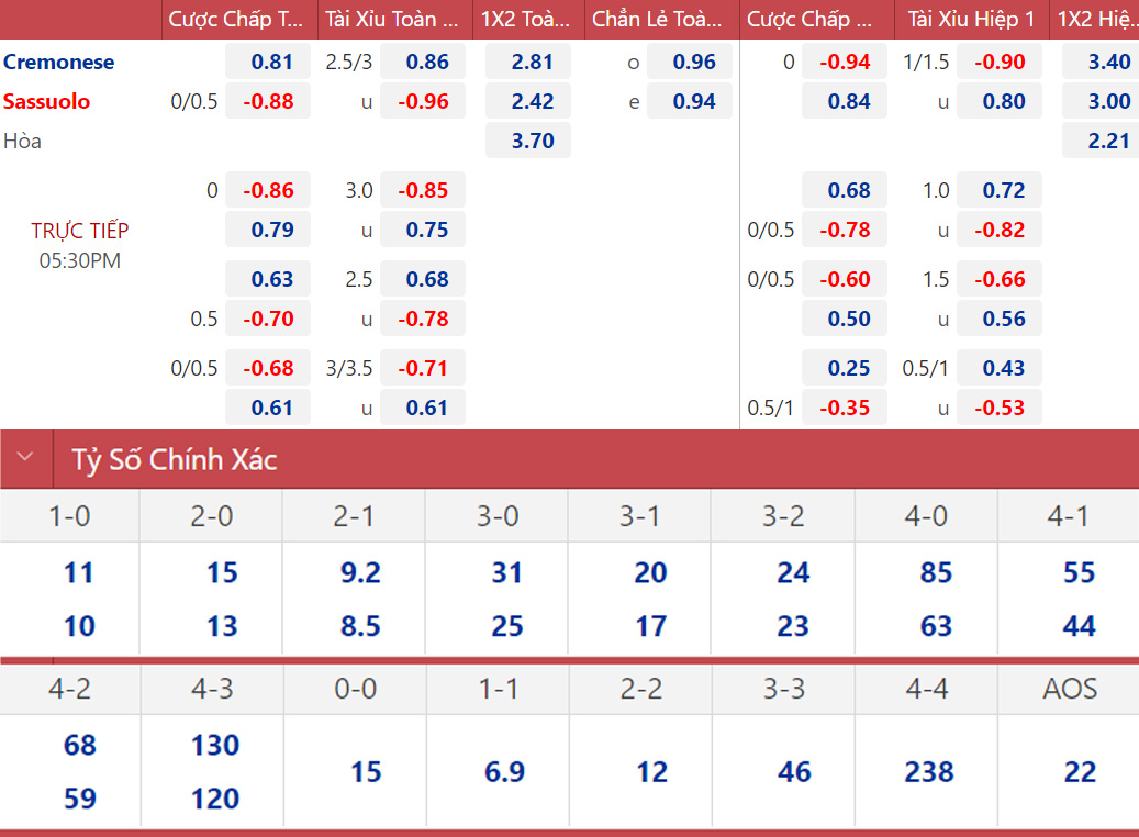 * 17h30, 4/9: Cremonese vs Sassuolo