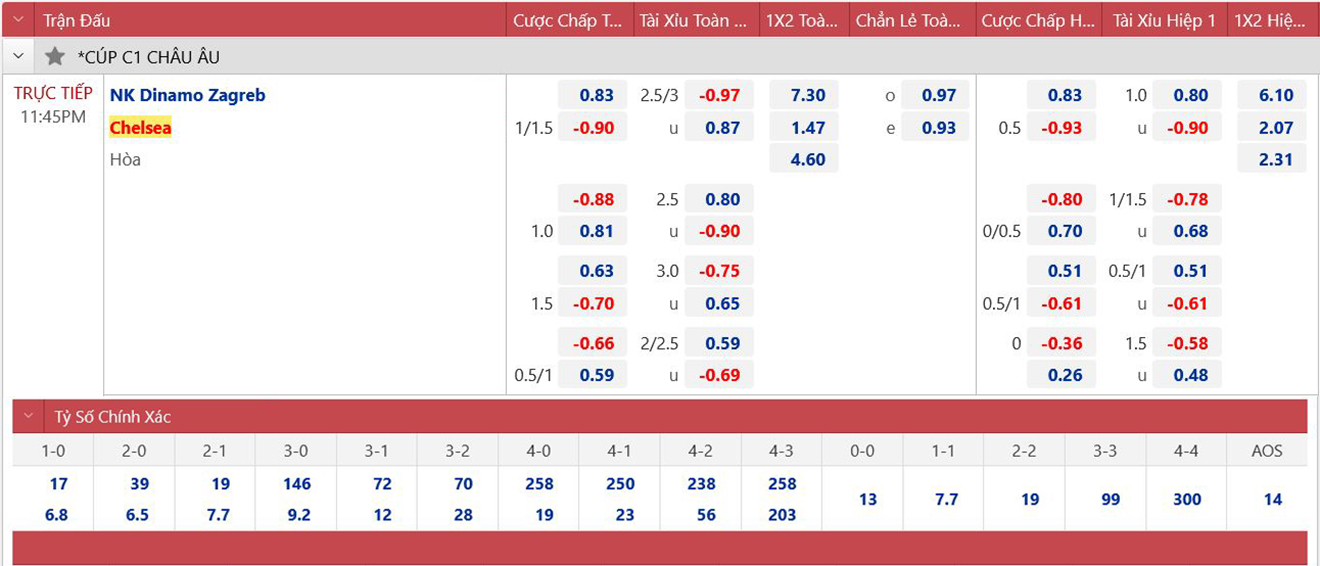 * Tỷ lệ kèo 90 phút: Dinamo Zagreb 1 1/4 : 0 Chelsea