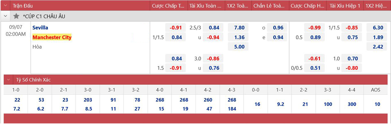 * Tỷ lệ kèo 90 phút: Sevilla 1 1/4 : 0 Man City