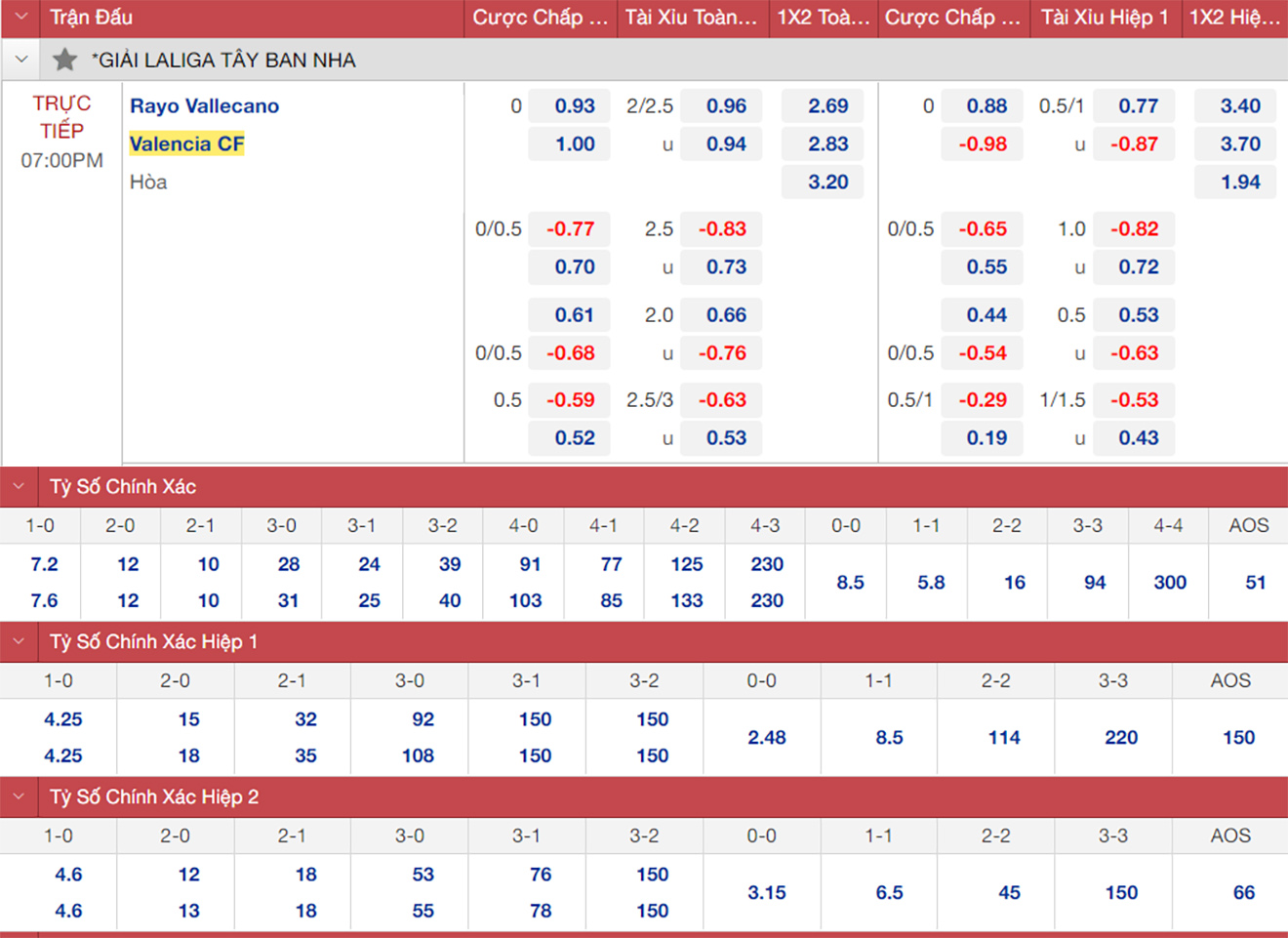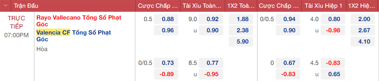 Ở 2 lần gần nhất Rayo Vallecano gặp Valencia, tỉ số đều là 1-1. 5 trận gần nhất đá sân khách tại La Liga, Valencia không thắng trận nào. Do vậy, nhiều khả năng trận đấu tới sẽ có kết quả hoà.
