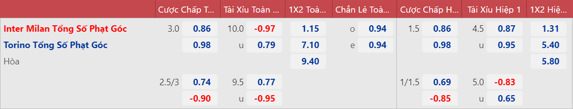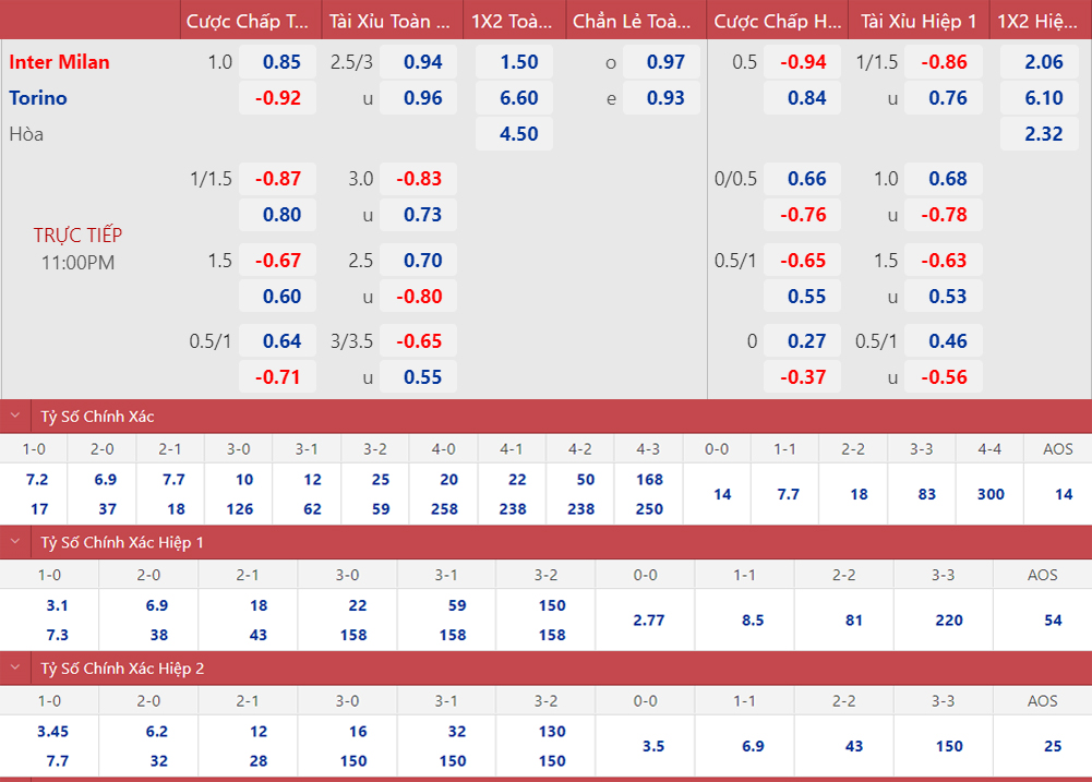 Trong 3 lần gần nhất làm khách trên sân của Inter, Torinho thất bại cả 3. Thậm chí, trong 6 lần đối đầu gần nhất, Torino cũng chỉ có 1 trận hòa khi được đá trên sân nhà. Vì thế, khả năng có điểm của Torino vòng đấu này rất thấp.