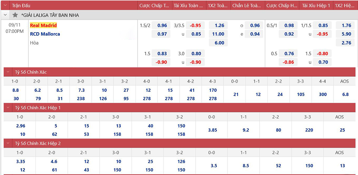 * Tỷ lệ/kèo 90 phút: Real Madrid 0 : 1 3/4 Mallorca