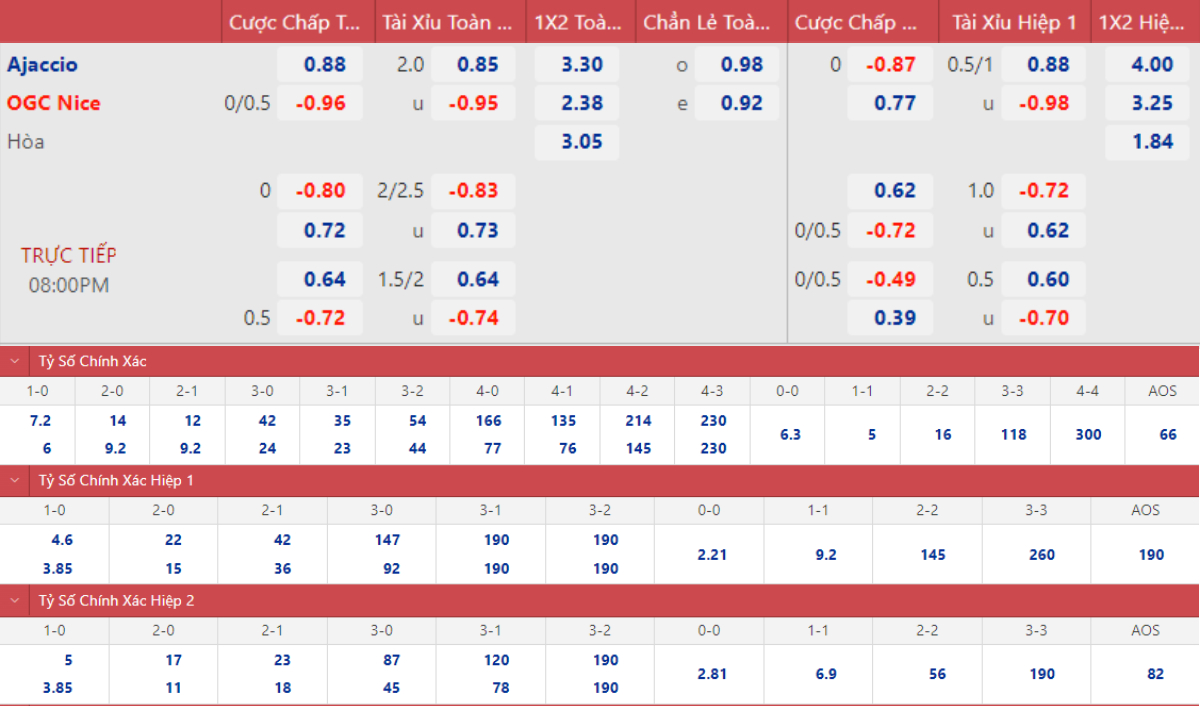 Về đối đầu, Nice cũng nhỉnh hơn so với Ajaccio, Trong 6 trận gần nhất hai đội gặp nhau, Nice thắng 3, thua 1 và hòa 2.